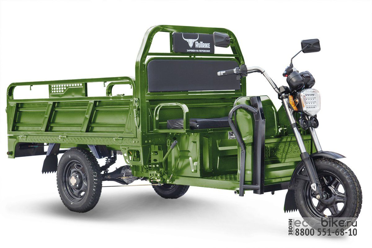- электрический трицикл Rutrike D4 оснащён вместительным кузовом габаритами 1800 x 1200 x 450 мм (Д х Ш х В), в котором можно перевозить груз общим весом до 1 тонны;