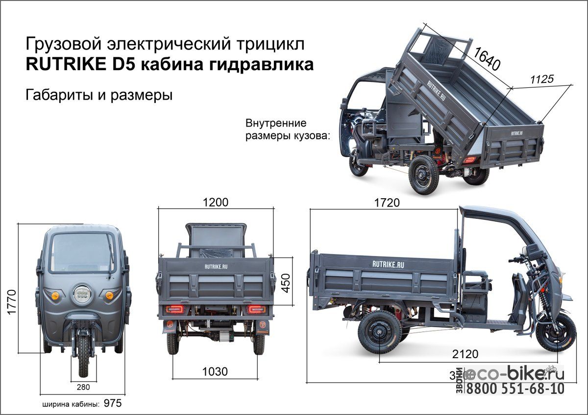 Электрический трицикл Rutrike D5 Кабина гидравлика оснащён крепким и вместительным кузовом с высокими бортами и гидравлическим подъёмным механизмом, позволяющим быстро осуществлять погрузку-разгрузку. Мощный гидравлический подъёмный привод позволяет поднимать кузов с загрузкой до 400 кг. А общая грузоподъёмность трицикла составляет до 900 кг.