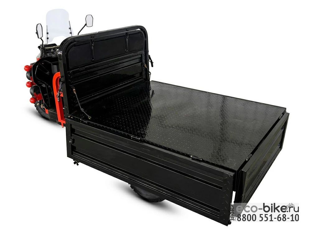 Оптимальный кузов размером 1800 × 1380 × 420 мм, усиленный вертикальными 5 рейками, откидные борта на быстросъёмных петлях с ограничителями, цельные усиленные борта из ребристого металла, двойной железный бампер, уникальные передние стробоскопы, хромированный руль с перекладиной, тормозная система с ручником, усиленный грузовой мост, двойная 5-рессорная система (10 листов) с двумя отбойниками и двумя рейками стабилизации, надёжная батарея 60V 62 А·ч и пониженная передача — всё это делает модель готовой к перевозке самых тяжёлых грузов.